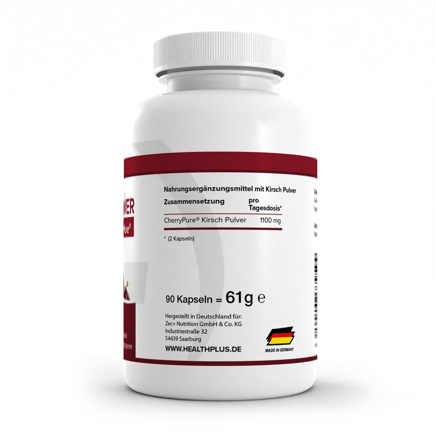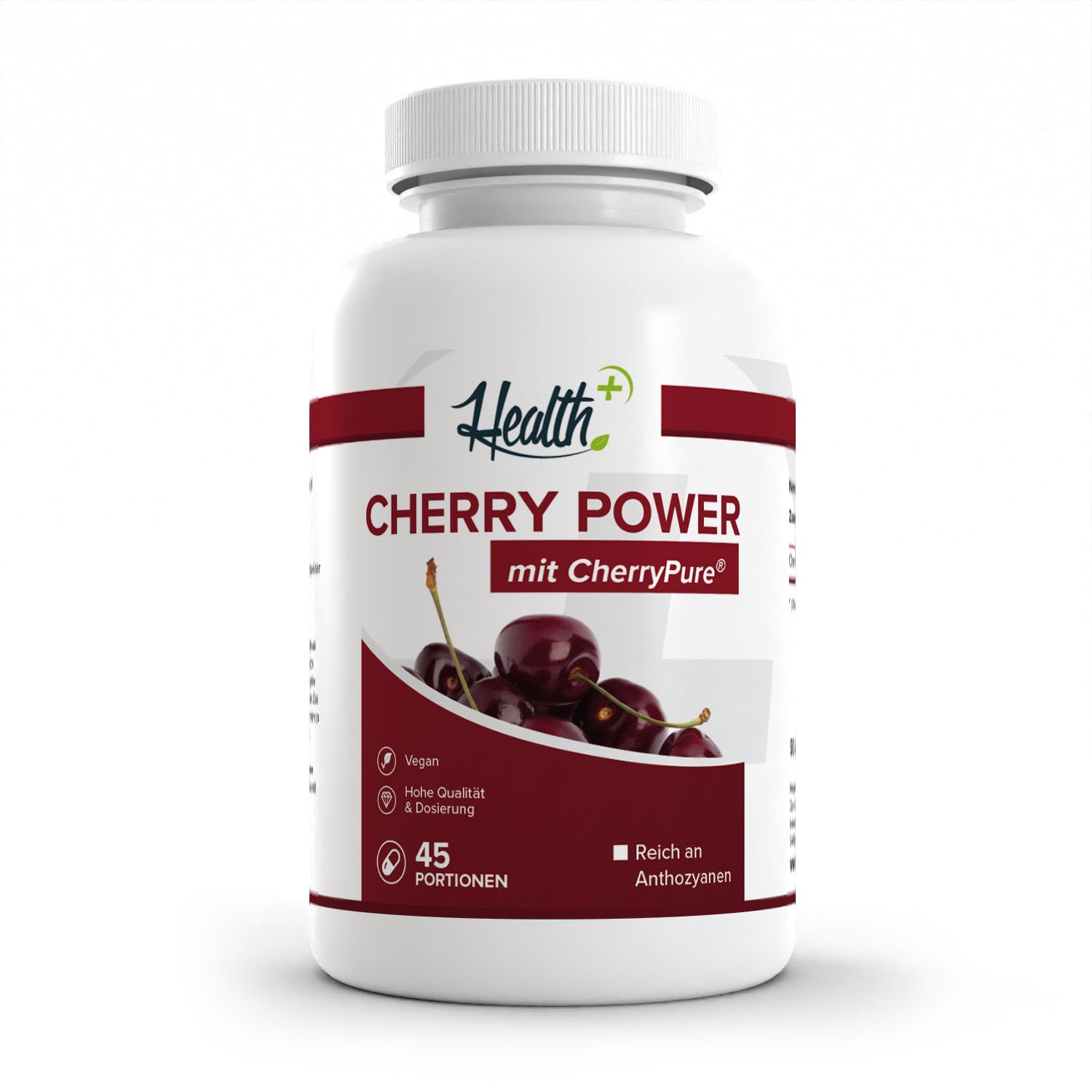 Ingredientes: CherryPure® (polvo de cereza, espesante goma guar, emulsionante lecitina de girasol, cápsula (hidroxipropilmetilcelulosa)