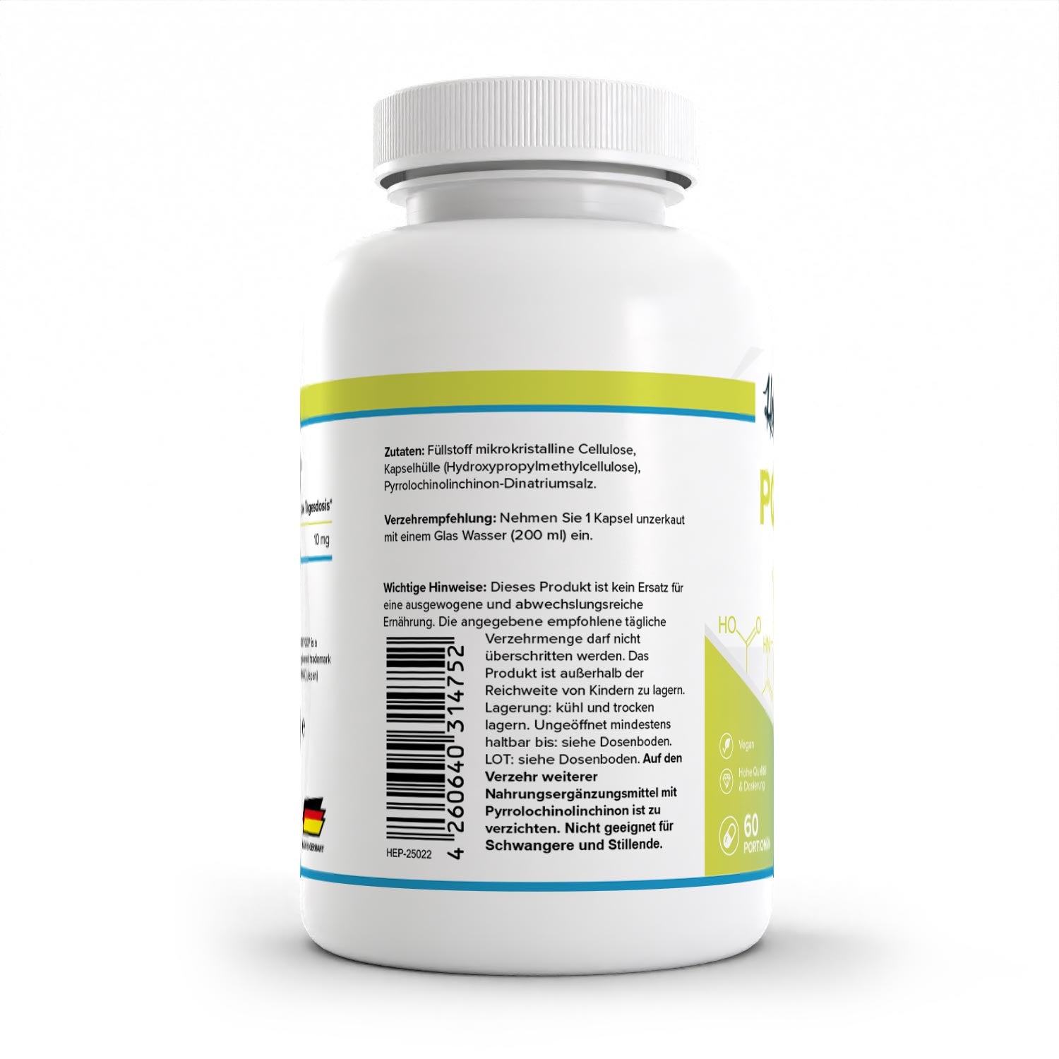 Ingredientes: Relleno celulosa microcristalina, cápsula (hidroxipropilmetilcelulosa), sal disódica de pirroloquinolina quinona.